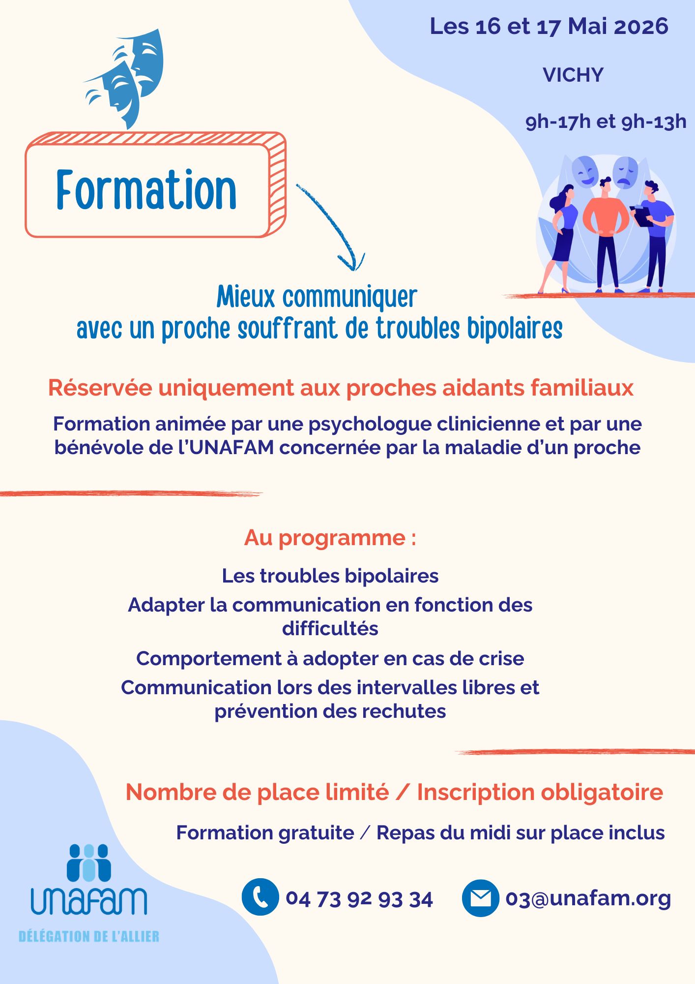 Cette formation a pour objectif de permettre aux proches de personnes vivant avec des troubles bipolaires de mieux comprendre les troubles et de mettre en place une communication adaptée afin de faire face un peu plus sereinement aux conséquences de la maladie, d’améliorer la relation et de se préserver.
