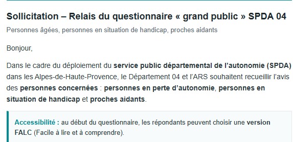 L'ARS, le Département des Alpes-de-Haute-Provence (via le service public départemental de l'autonomie) et votre délégation UNAFAM 04 vous propose de participer à cette enquête concernant les personnes en situation de pertes d'autonomies (sous toutes les déclinaisons du terme)