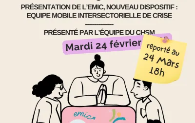 Le centre hospitalier Sainte Marie présente son nouveau dispositif, l'Equipe Mobile Intersectorielle de Crise - EMIC - La séance débutera à 18 heures et sera suive d'un temps d'échange.