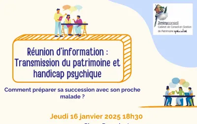 Comment préparer sa succession avec son proche malade, réunion animée par Magali Krug, conseillière en gestion du patrimoine spécialisé chez Jiminyconseil. la transmission du patrimoine les protections juridiques la protection de la fratrie Réunion sur inscription au siége de l'UNAFAM, suivie d'un...