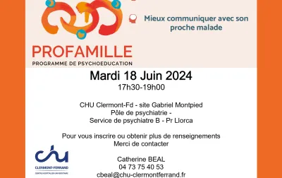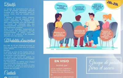 Un nouveau groupe de psychoéducation à destination des frères et soeurs (majeurs) ayant un proche présentant des troubles psychiques doit débuter en visio le 26 septembre. Une réunion d'information aura lieu le mardi 2 jullet à 18 heures. Un lien sera envoyé avant la réunion, l'inscription est...