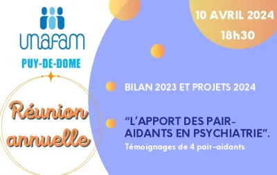 L"UNAFAM organise sa réunion annuelle le mercredi 10 avril à 18h30 et propose à 19h30 l'intervention de 4 pair-aidants pour parler de leur apport dans la psychiatrie.