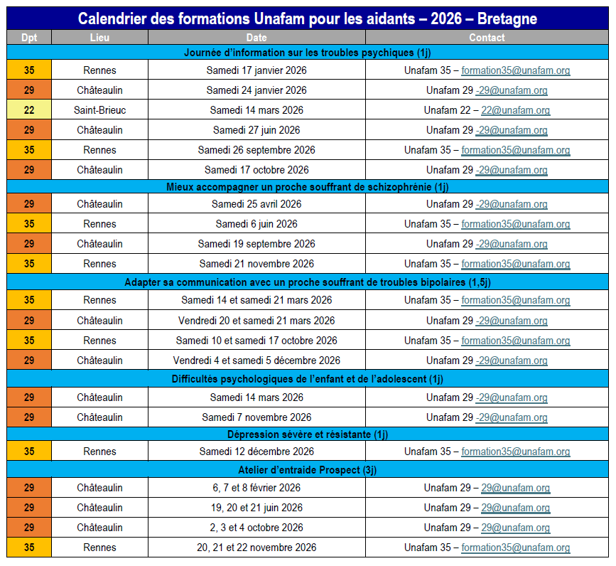Chaque délégation départementale organise des formations ou des journées d'information à l'attention des familles et des proches de personnes malades et/ou handicapées psychiques.
