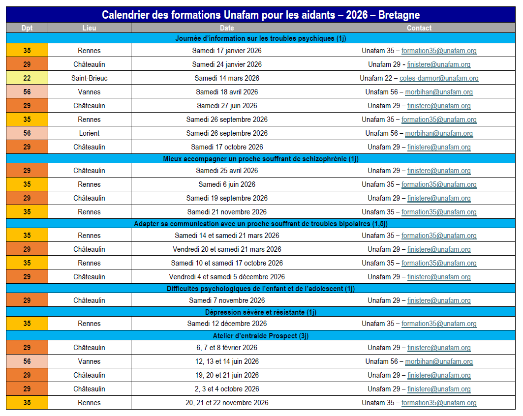 Chaque délégation départementale organise des formations ou des journées d'information à l'attention des familles et des proches de personnes malades et/ou handicapées psychiques.