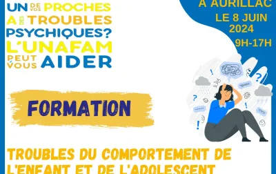 La délégation Unafam 15 organise une formation "Mieux accompagner un proche souffrant de schizophrénie" Lieu: 45 avenue de la République, 15000 Aurillac Date: Le samedi 21 septembre 2024 de 9h à 17h Public: Proches aidants familiaux Inscription obligatoire : 04 73 92 93 34 ou 15