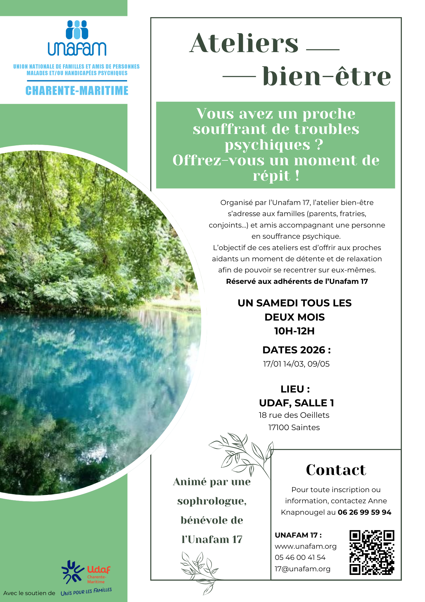 L'UNAFAM 17 vous propose des ateliers bien-ĂȘtre gratuits, un samedi tous les deux mois de 10h Ă 12h Ă Saintes.