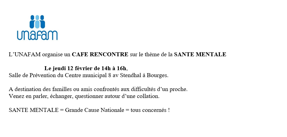 L'UNAFAM organise un café rencontre gratuit et ouvert à tous les proches, sur le thème de la Santé Mentale.Le jeudi 12 février de 14h à 16h.Salle de Prévention du CMSP, 8 av Stendhal à Bourges, (quartier des Gibjoncs).