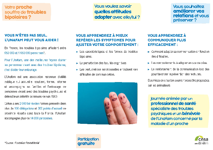 - 2 journées, de 9h à 17h, animées par une psychologue clinicienne et un bénévole de l'UNAFAM spécialement formé