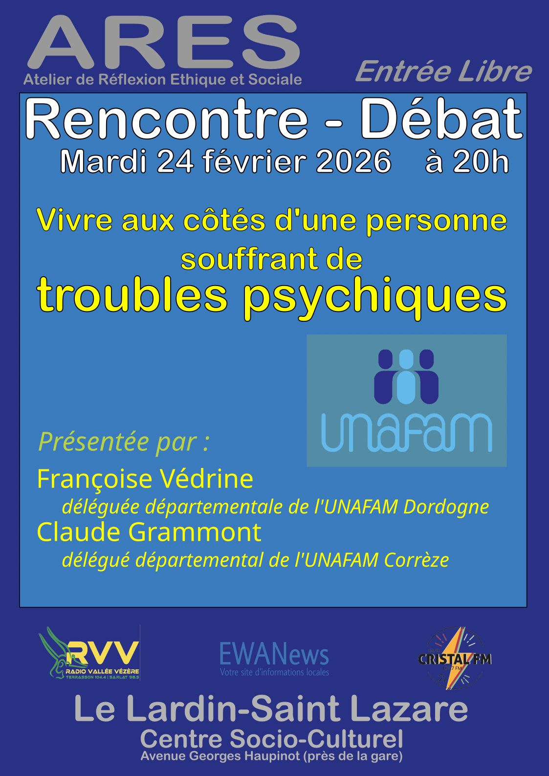L'association ARES (Atelier de Réflexion Ethique et Sociale) organise une Rencontre-débat avec l'UNAFAM 19 et l'UNAFAM 24