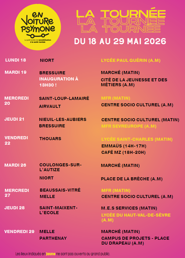 Avec le soutien de l'Agence Régionale de Santé, de la Macif et de la CPAM des Deux-Sèvres. En partenariat avec le Projet Territorial de Santé Mentale (PTSM), Niort Agglo, l'Agglo 2B, les hôpitaux de Niort et du Nord Deux-Sèvres, l'UDAF 79, l'Adapéi 79, Tremplin Messidor, les mairies de Thouars et Bressuire, le Conseil Local de Santé Mentale du Bocage Bressuirais, les Contrats Locaux de Santé du Bocage Bressuirais, du Niortais, Tanlib, des communautés de communes Haut Val de Sèvre et Mellois en Poitou et du Pays de Gâtine, Promotion Santé Nouvelle-Aquitaine, Unis Cité, Appui & Vous 79, le 3114, VigilanS Poitou-Charentes, la MSA Poitou, les Groupes d'Entraide Mutuelle du département (Au fil de la Mosaïque, Espoir et Vie, Vent de l'Espoir, GEM l'Avenir, Echap'à Thouars), Radio Pinpon.