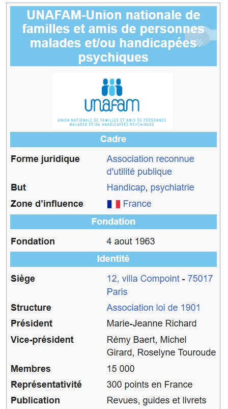 L’UNAFAM est une association créée le 4 août 1963 par des familles ayant un proche souffrant de troubles psychiques, avec le soutien de la Ligue française d'hygiène mentale, le Professeur Paul Sivadon, un des pionniers de la psychiatrie moderne et le Docteur Édouard Toulouse, un de ses fondateurs. En 1968, elle est reconnue d'utilité publique