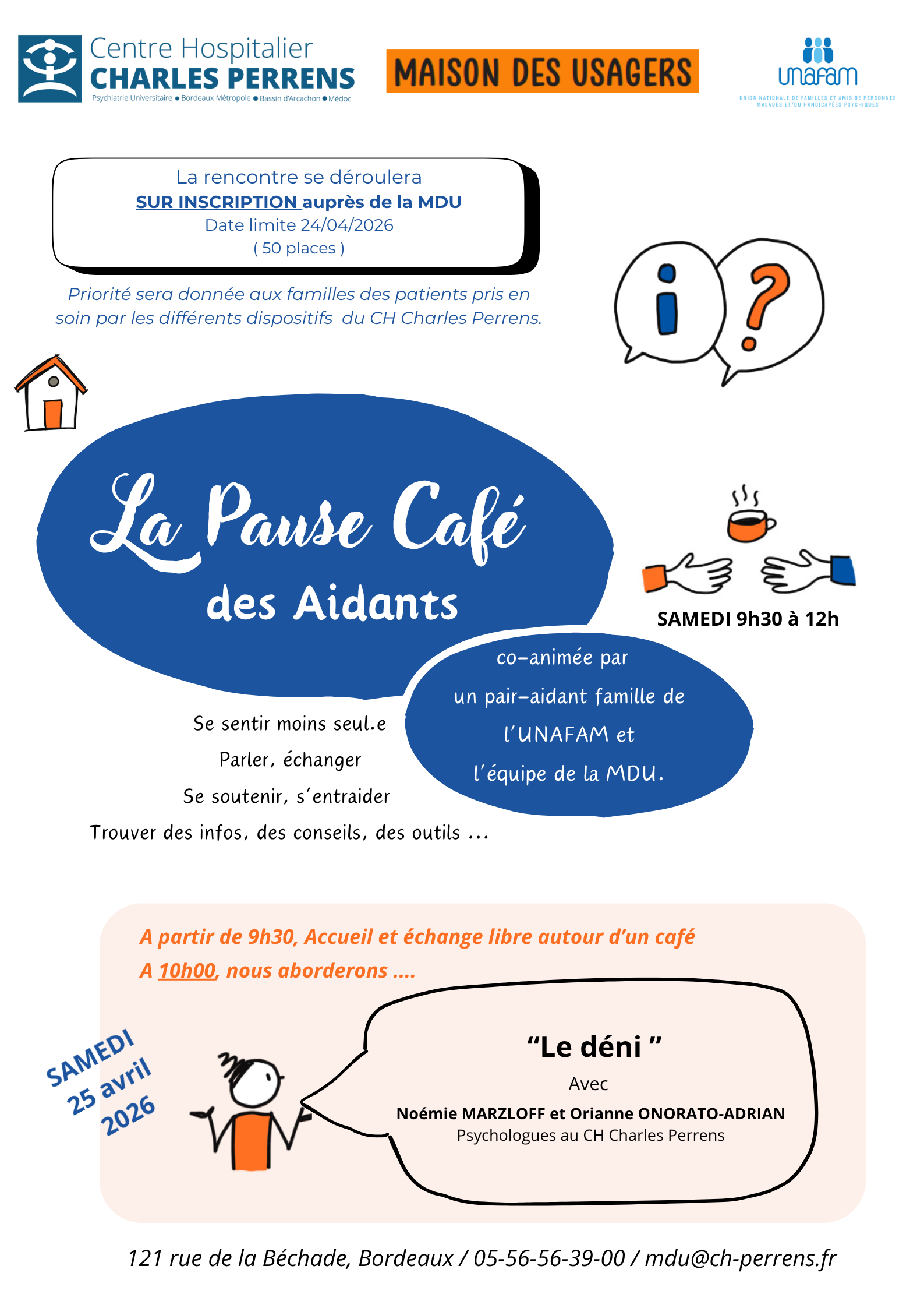 L(Unafam et la MDU de Charles Perens organisent une pause au café des aidants le 25/04/26.sur le thème du déni. Entrée gratuite sur inscription dans les limites de 50 participants. Inscription, par téléphone ou par mail, auprès de Marie-Do, 05 56 56 39 00 / mdu