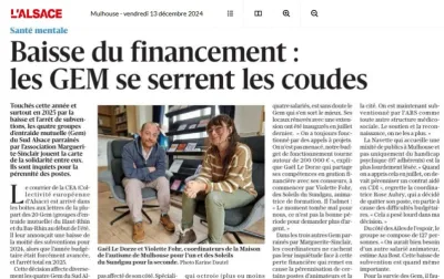 Les groupements d'entraide mutuelle (GEM) ont appris cet été la baisse de 50% de l'aide pour 2024 et de la totalité pour 2025 de la part de la collectivité européenne d'Alsace. Nous rappelons que les GEM sont des lieux qui permettent le soutien et l'insertion sociale des personnes confrontées à des...