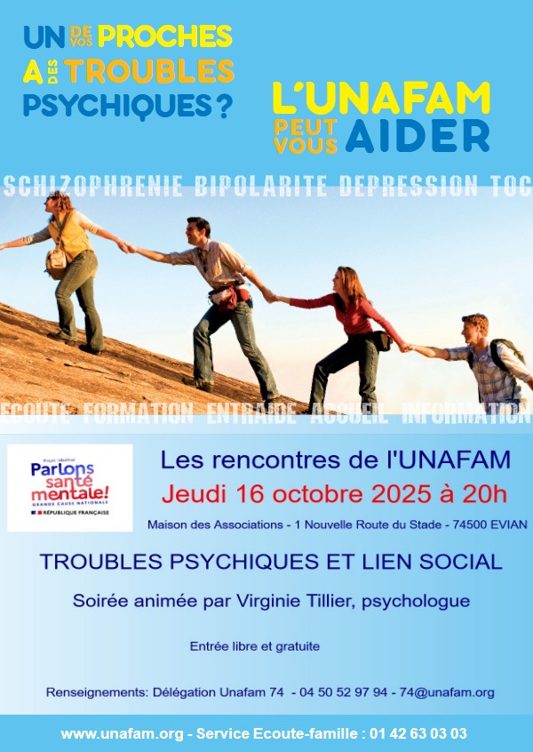 - La rencontre débat "Troubles psy et lien social" du jeudi 16 octobre à 20h sera animée par Virginie Tillier, psychologue. Elle se déroulera à la Maison des associations à Evian