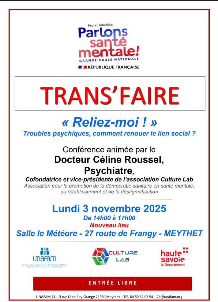 - La conférence Trans'Faire sera animée par le Dr Roussel à la salle du Météore à Annecy-Meythet le lundi 3 novembre dès 14h. Le thème en sera "Reliez-moi - Troubles psychiques, comment renouer le lien social"