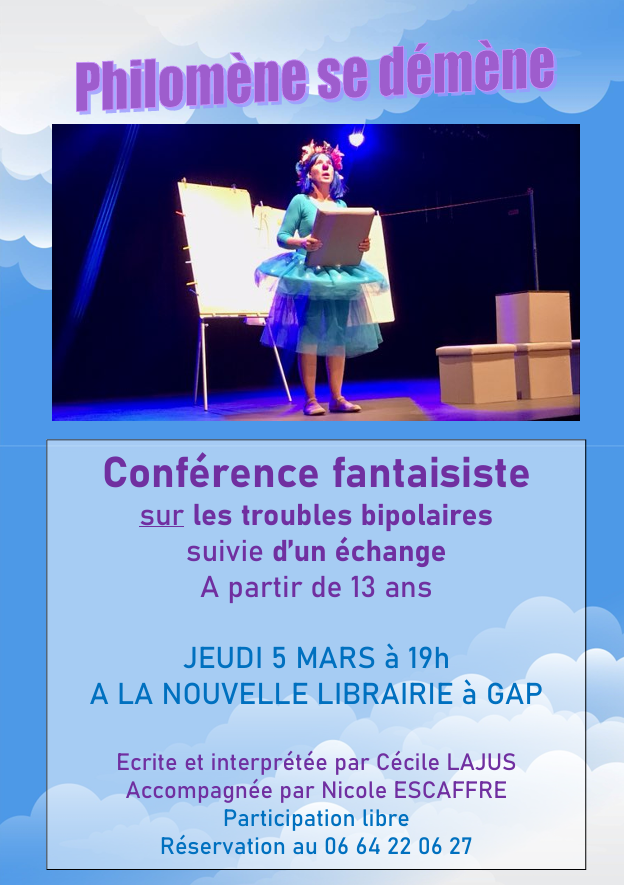 Nous vous invitons à découvrir un spectacle de café-théâtre "Philomène se démène" consacrer aux troubles bipolaires, ouvert à toutes et à tous. Le jeudi 5 Mars à 19h à la Nouvelle Librairie à Gap.