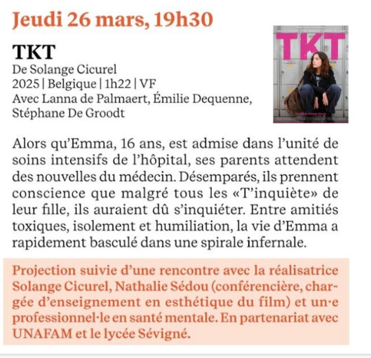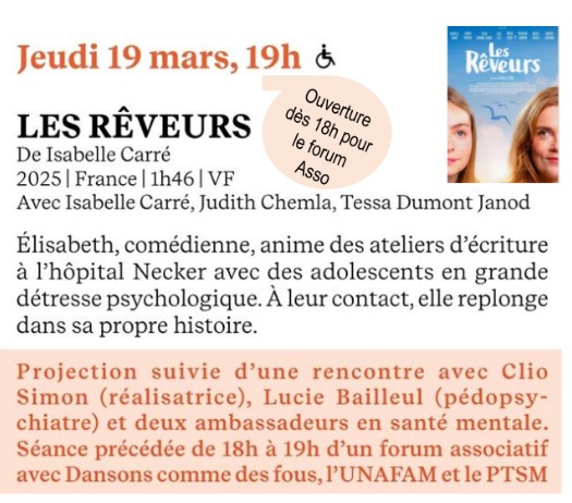 Nous tiendrons un stand et un débat sera ouvert à l'issue de la séance avec notamment la participation de professionnels de la santé, de jeunes concernés et les réalisatrices des 2 films, les Rêveurs et TKT.