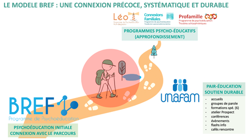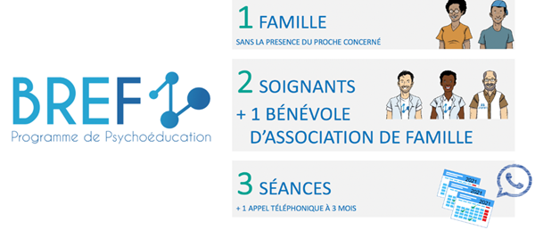 BREF est un programme de psychoéducation, unifamilial, court, composé de 3 séances d’une heure chacune et d'un rappel téléphonique à 3 mois.