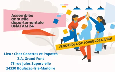 L'UNAFAM 24 organise son assemblée annuelle le vendredi 4 octobre à 15h Chez Cocottes et Popotes (Zone Grand Font, 78 rue Jules Supervielle) à Boulazac. Nous serons heureux de vous accueillir nombreux pour vous présenter nos dernières activités et nos projets. Un temps d'échange sera prévu avec les...