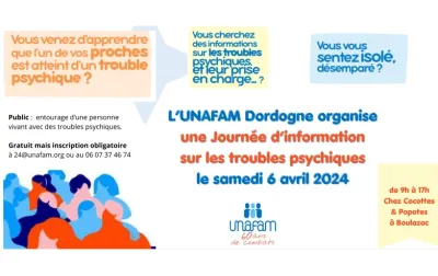 L'UNAFAM DORDOGNE organise une Journée d'information sur les troubles psychiques le samedi 6 avril 2024. Cette journée d’information permet à toute personne nouvellement confrontée à la maladie psychique d’un proche (schizophrénies, bipolarité, dépression, TOC), d’acquérir les repères essentiels sur...
