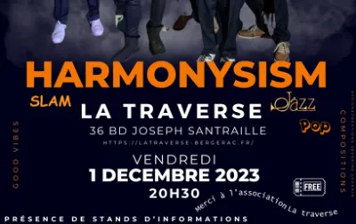En raison de l'absence de l'un des membres du groupe d'Harmonysism, le concert prévu à la Traverse le 1er décembre est annulé. Nous espérons qu'il soit reporté en janvier. Ce groupe est né de la rencontre entre musiciens amateurs et professionnels et auteurs ayant des parcours de vie bien différents...