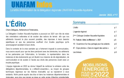 Le nouveau numéro de votre lettre régionale Unafam Infos vient de paraître. Vous y retrouverez toutes les actualités régionales et des délégations de Nouvelle-Aquitaine. Vous pouvez également lire les anciens numéros dans notre rubrique Ressources