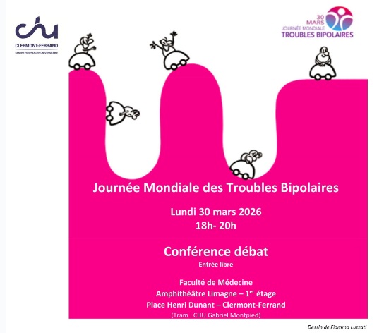 À l'occasion de la Journée Mondiale des Troubles Bipolaires, le CHU de Clermont-Ferrand, en partenariat avec l'UNAFAM, la Fondation FondaMental et l'Université Clermont Auvergne, a le plaisir d'organiser une conférence-débat.