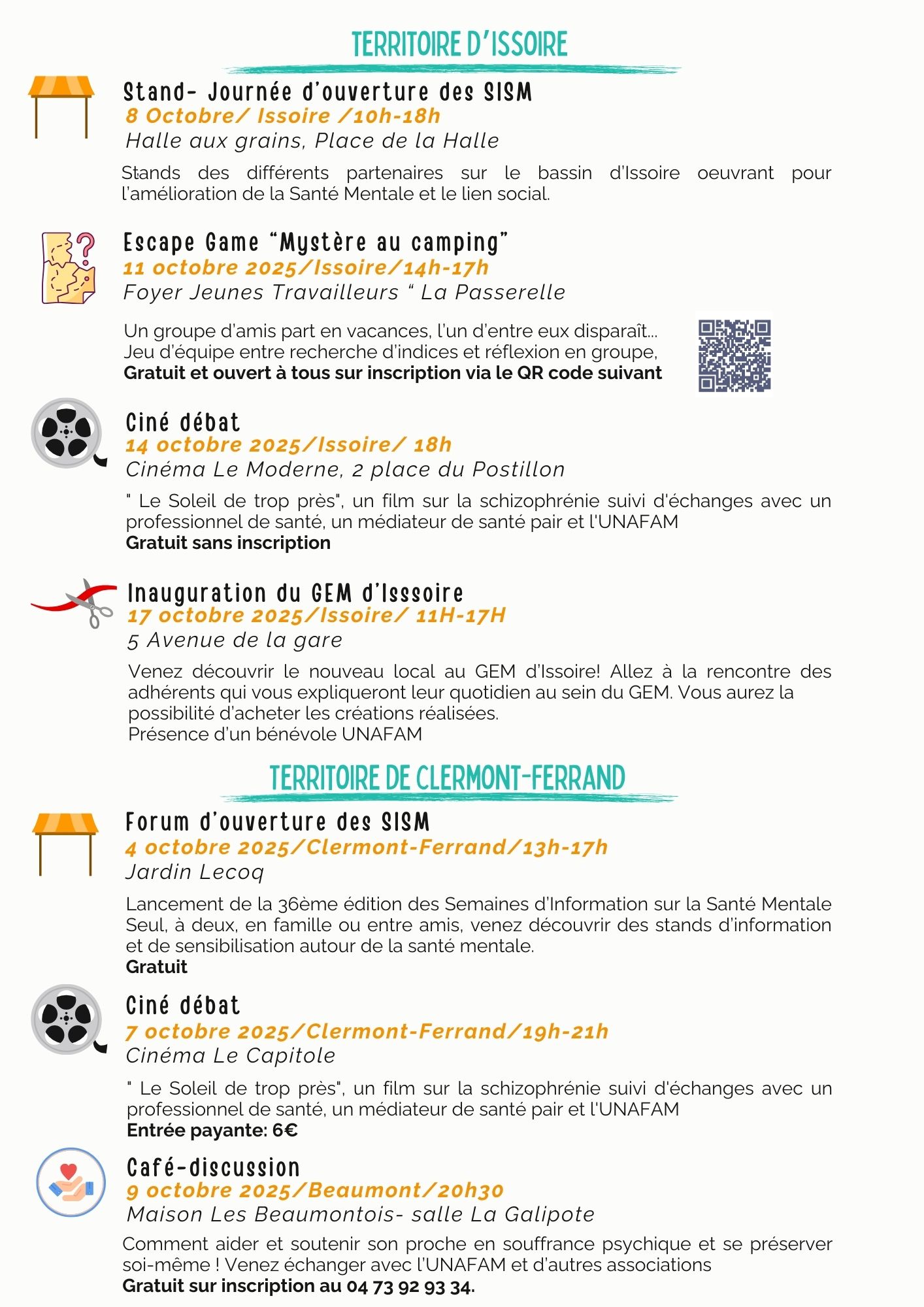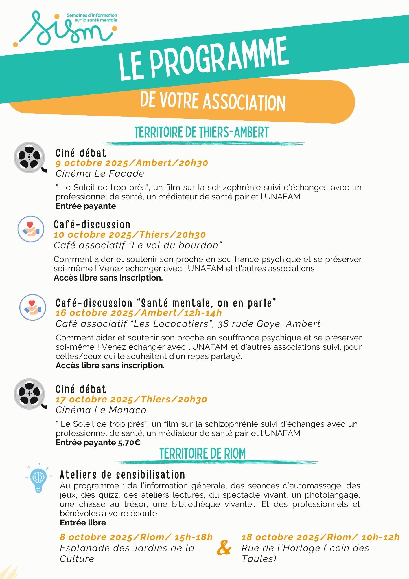 L'UNAFAM, quant à elle, a établi une programmation par territoire -Thiers.Ambert, Riom, Issoire et Clermont-Ferrand.
