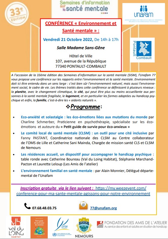 A l’occasion de la 33ème édition des Semaines d'information sur la santé mentale (SISM), l’Unafam de Seine-et-Marne vous propose une conférence sur les rapports entre l’environnement et la santé mentale.