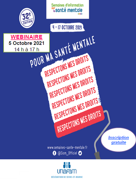 Dans ce cadre l'UNAFAM de Seine-et-Marne va organiser un webinaire (ouvert à tous) "Pour ma santé mentale, respectons mes droits" le mardi 5 Octobre 2021 de 14h à 17h.