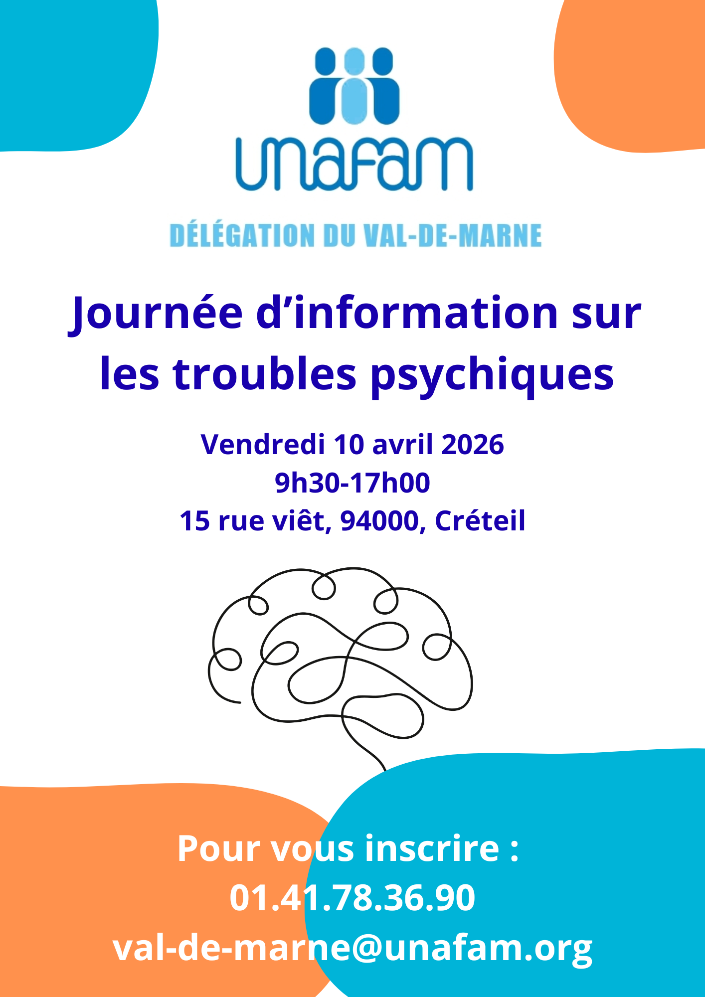 Vous accompagnez au quotidien un fils, une fille, un conjoint ou un parent touché par des troubles psychiques ? L'Unafam Délégation du Val-de-Marne vous invite à une journée d'information et d'échange le vendredi 10 avril 2026.