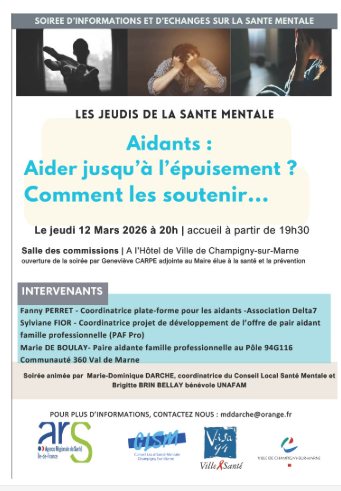 Être aidant, c'est accompagner un proche au quotidien, souvent au détriment de sa propre santé. Le Conseil Local de Santé Mentale de Champigny-sur-Marne vous invite à une soirée d'informations et d'échanges pour mieux comprendre cette réalité et découvrir les ressources disponibles.