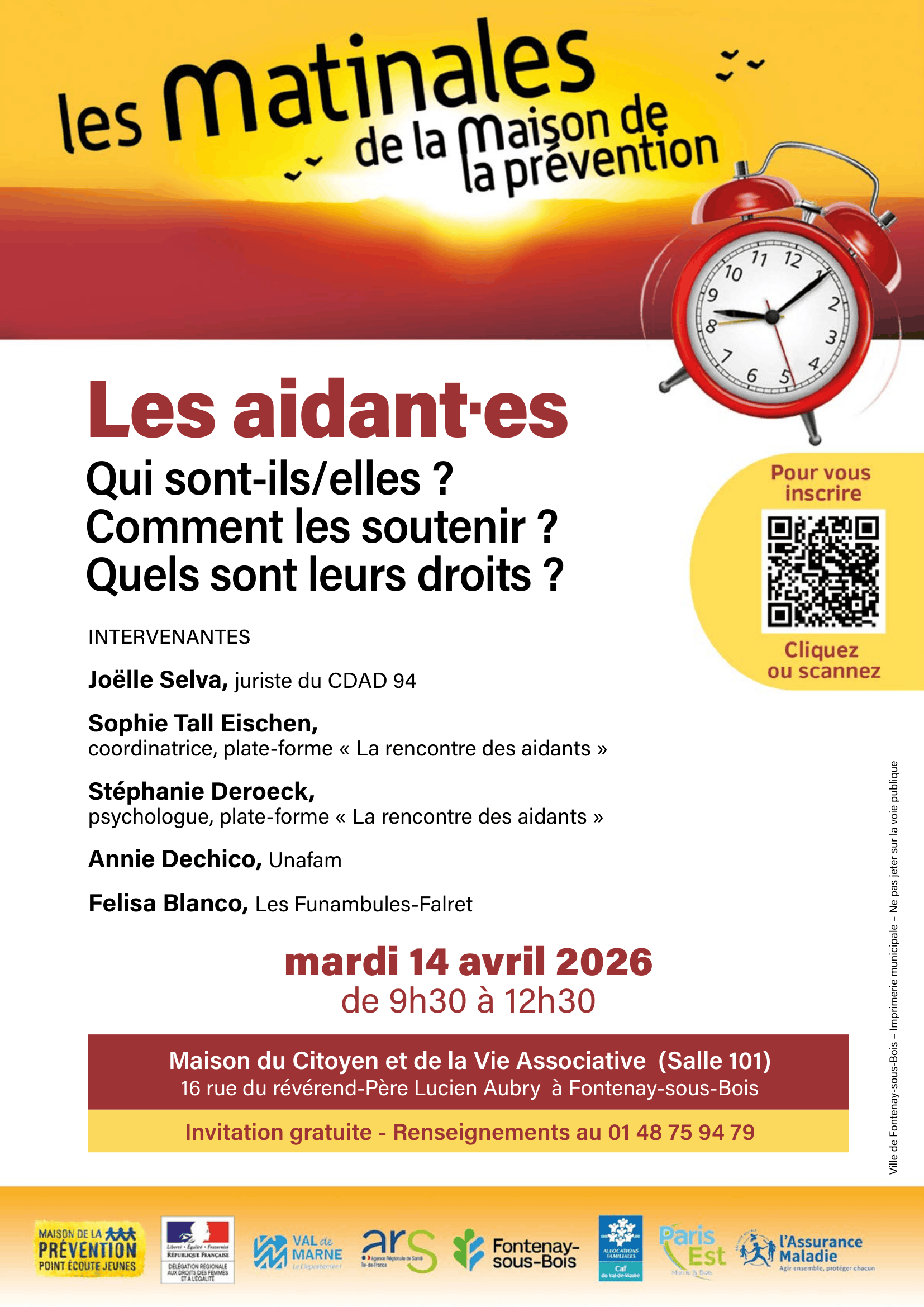 📅 Mardi 14 avril 2026 🕘 De 9h30 à 12h30 📍 Maison du Citoyen et de la Vie Associative (Salle 101) 16 rue du révérend Père Lucien Aubry 94120 Fontenay-sous-Bois