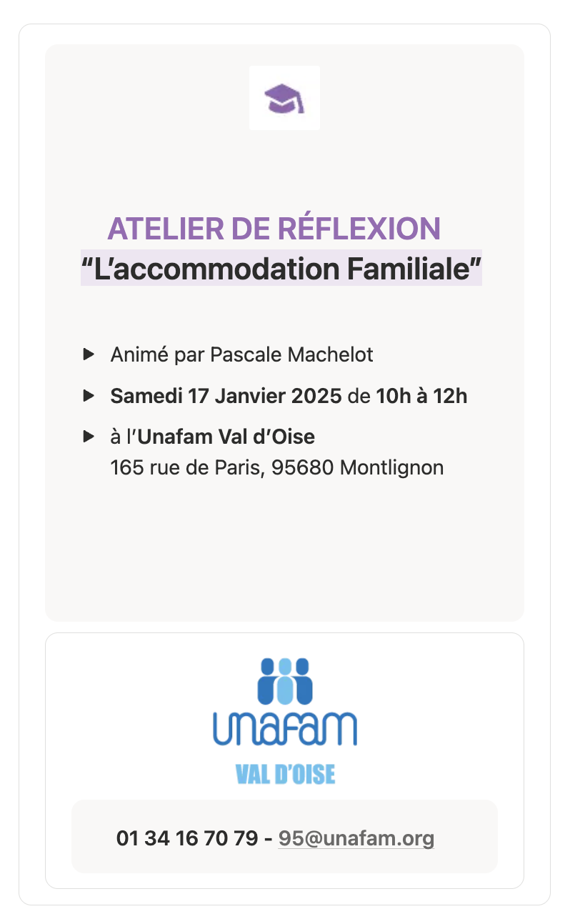 - Samedi 17 Janvier 2025 de 10h à 12h — L’ACCOMMODATION FAMILIALE