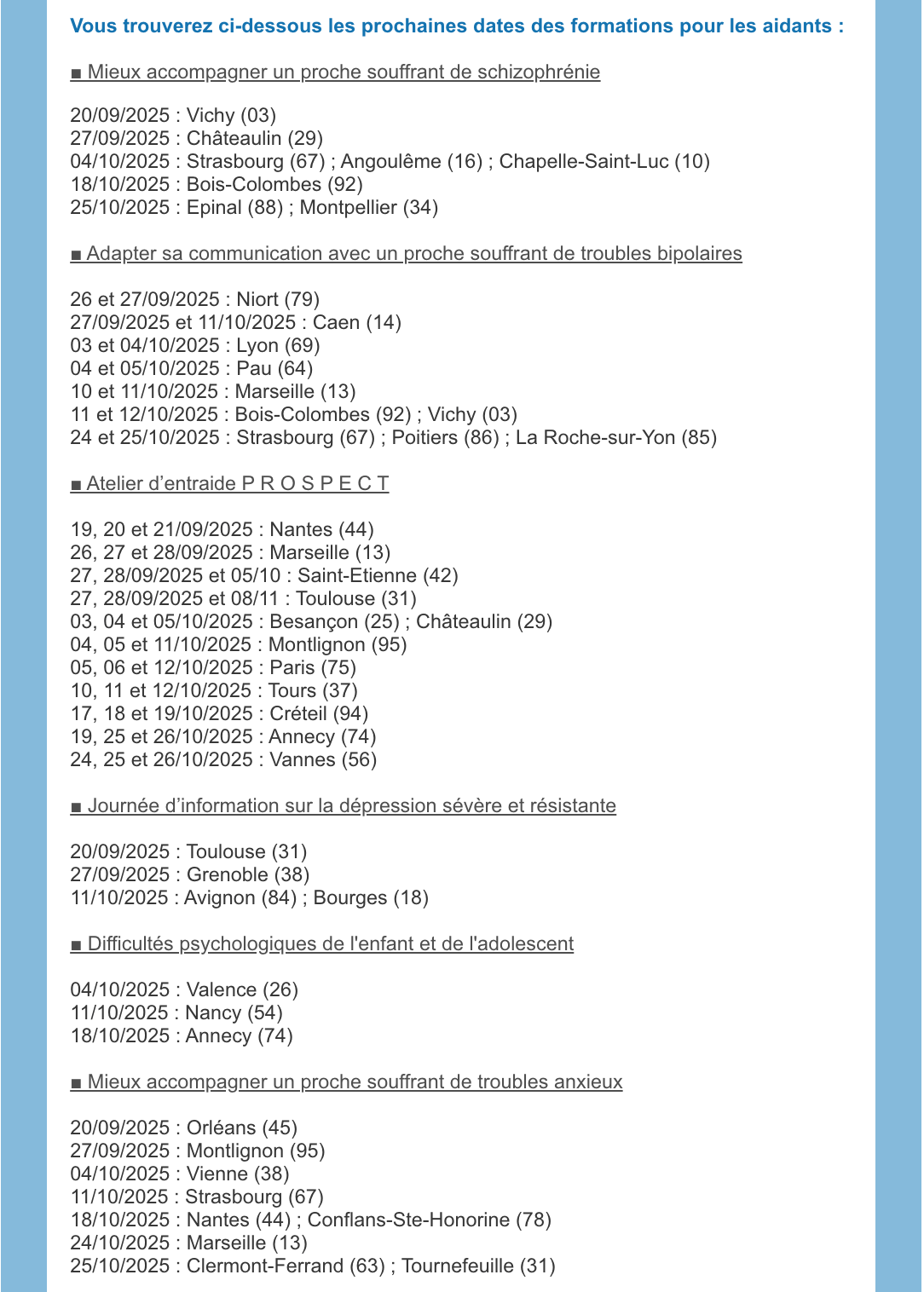 Dasn la liste ci-dessous, si des formations et leurs dates vous intéressent, il est tout à fait possible de vous y inscrire sans attendre, les renseignements et les inscriptions s'effectuent toujours auprès de la délégation : 95unafam [dot] org (95[at]unafam[dot]org) - 01.34.16.70.79 - de 9h00 à 17h00