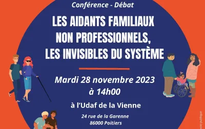 Plus d'informations : https://www.udaf86.fr/conference-debat-les-aidants-familiaux-non-professionnels-les-invisibles-du-systeme/