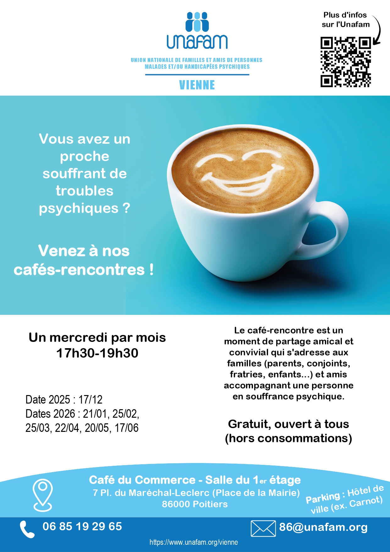 Les cafés rencontre ☕ sont des moments d'échanges conviviaux pour les familles (parents, fratrie, conjoints...) et/ou amis accompagnant un proche en souffrance psychique. Il n'y a pas toujours de thème particulier, chacun peut s'exprimer librement. Un ou plusieurs bénévoles sont là pour animer ce moment de convivialité. Il est possible de venir une fois ou deux seulement, ou d'en faire un rendez-vous mensuel !