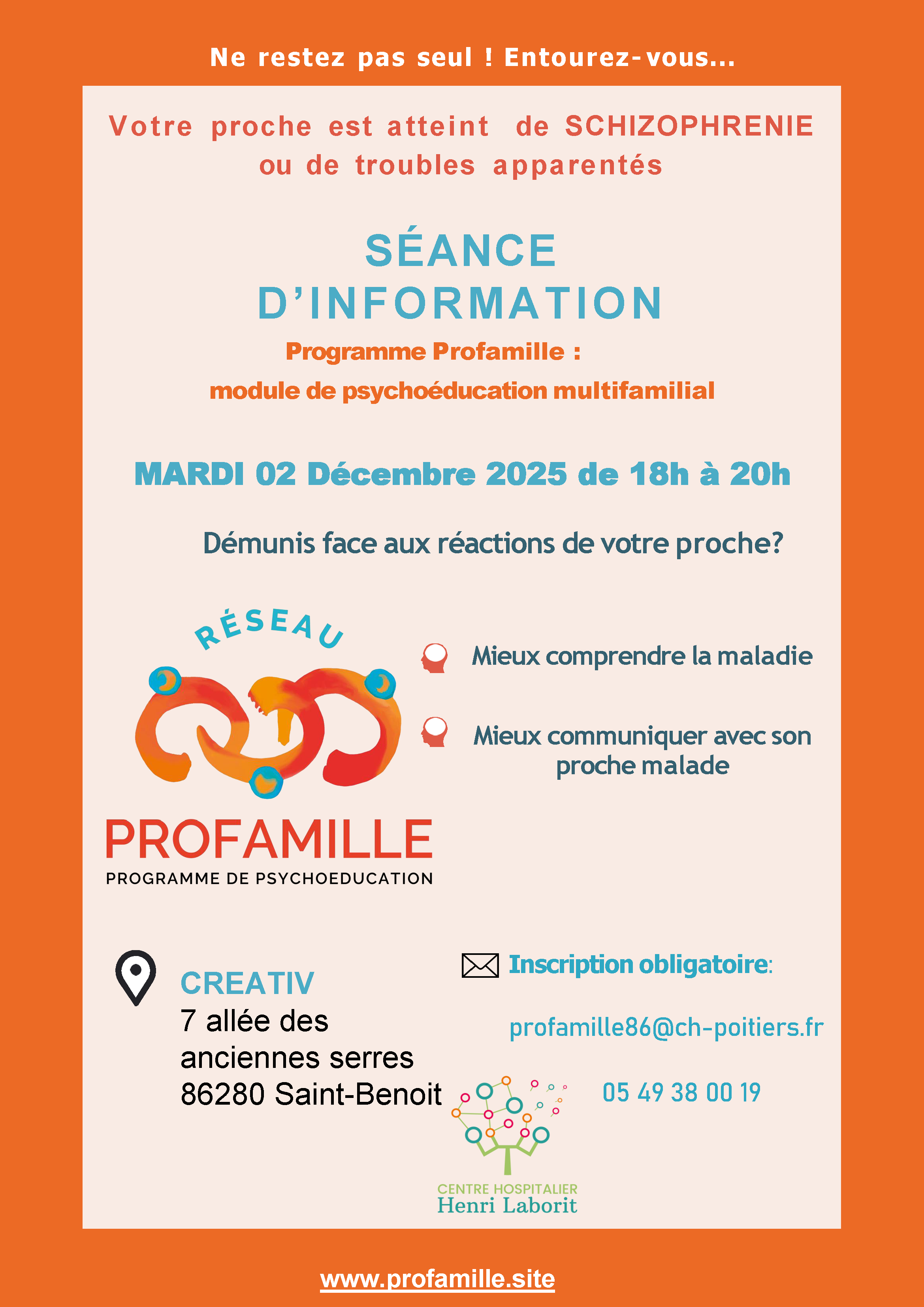 Le programme de psychoéducation PROFAMILLE, pour lequel l'UNAFAM 86 est partenaire, s'adresse aux proches de personnes souffrant de troubles schizophréniques et apparentés. Il permet d'améliorer les habiletés de communication, la gestion du stress et la résolution de problèmes. Investissement important, mais bénéfices considérables à la clef !