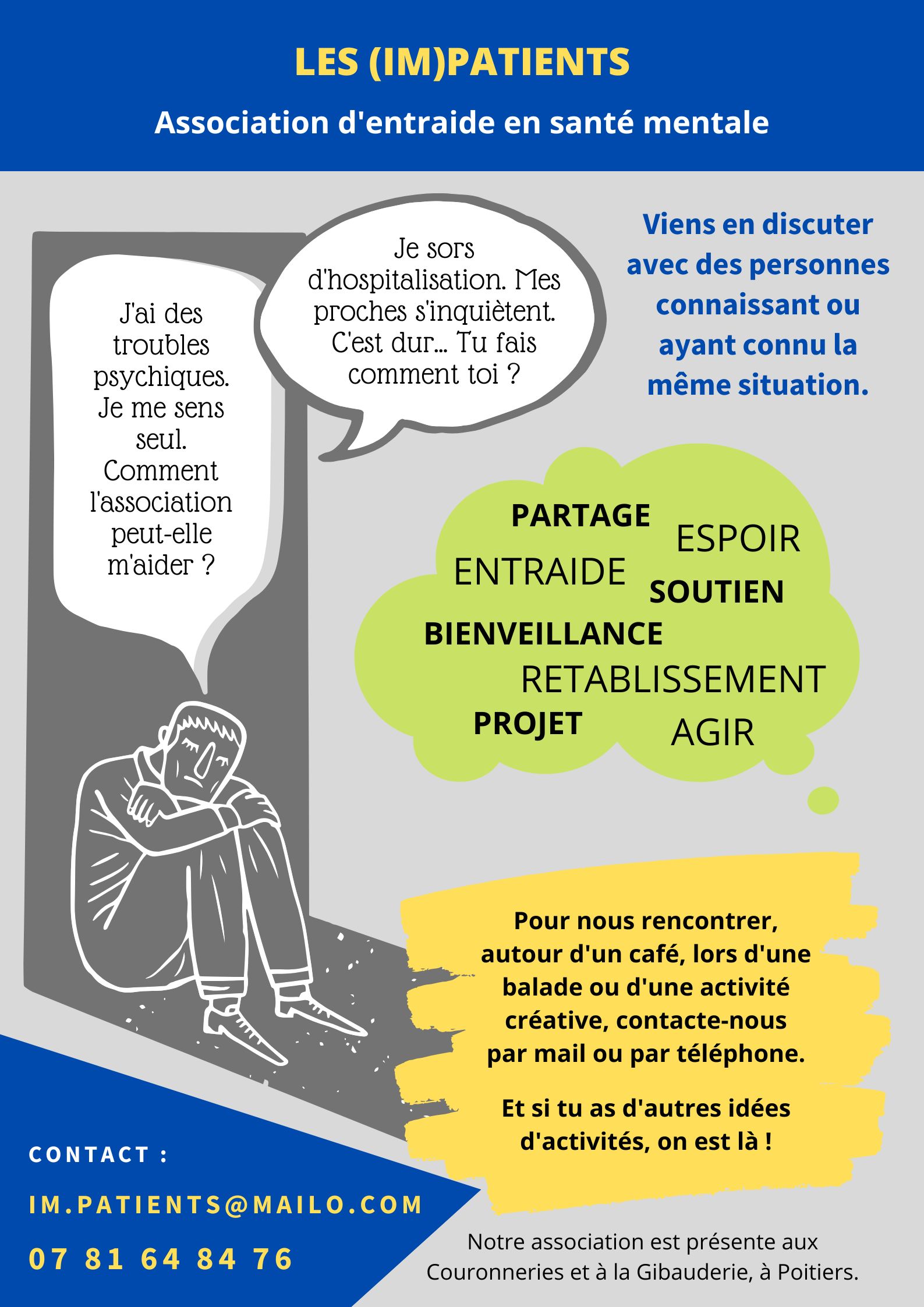 Les (Im)patients est une association d'entraide en santé mentale, localisée à Poitiers, créée par et pour des personnes vivant avec un trouble psychique.