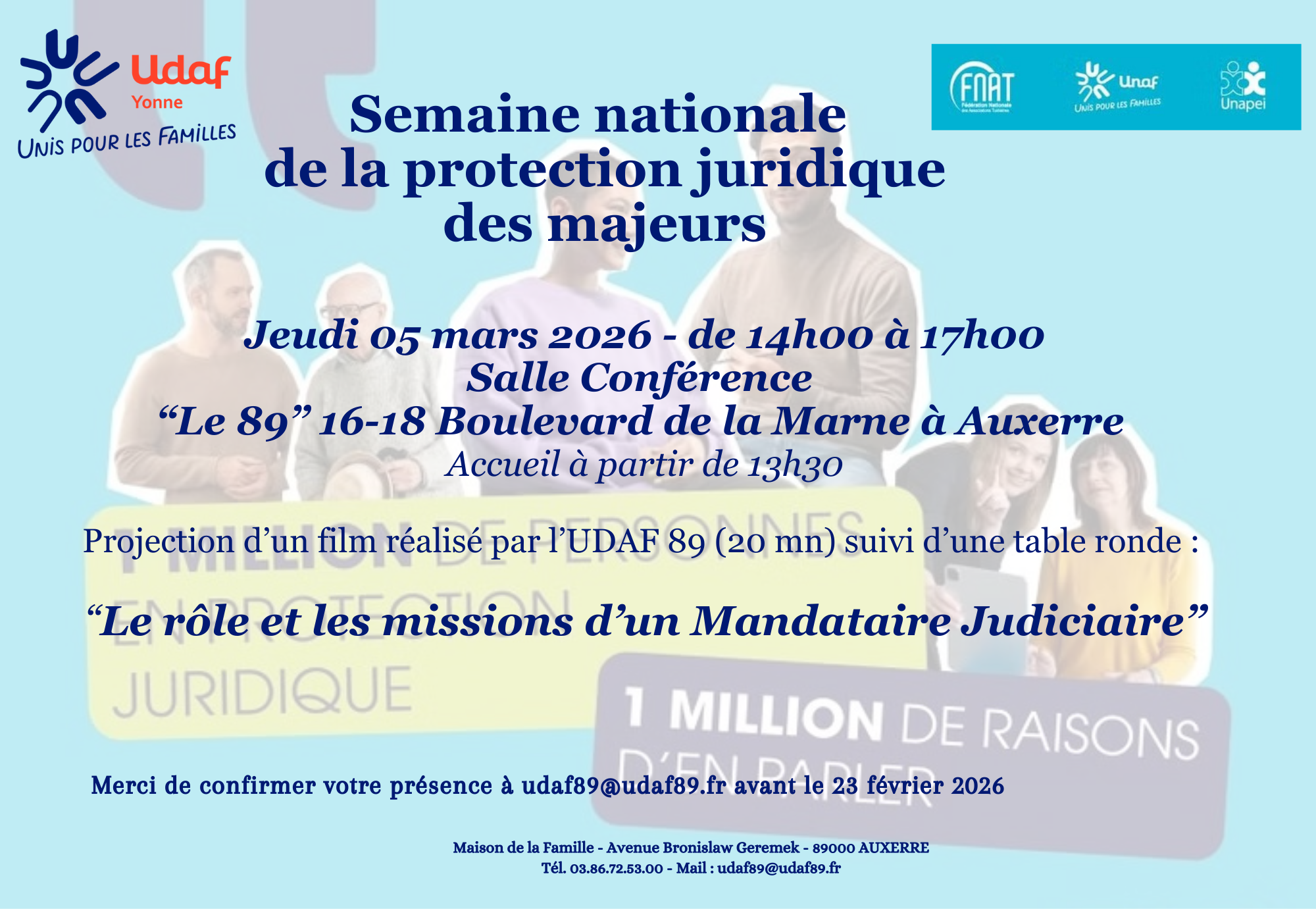 L’accès est gratuit, mais le nombre de places est limité aux 200 premiers inscrits : nous vous invitons donc à confirmer rapidement votre participation par courriel à udaf89