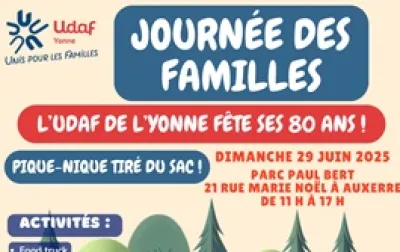 Journée dédiée aux familles, au parc Paul Bert à Auxerre de 11 h à 17 h. Les associations familiales du département seront présentes , Pour l'UNAFAM 89 P Giroud administrateur Unafam à l'Udaf 89 ainsi que N Lingier la déléguée départementale Unafam 89. ENTRÉE GRATUITE, OUVERT À TOUS