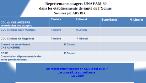 Les établissements de santé et les représentants Unafam avec explication de chaque commission